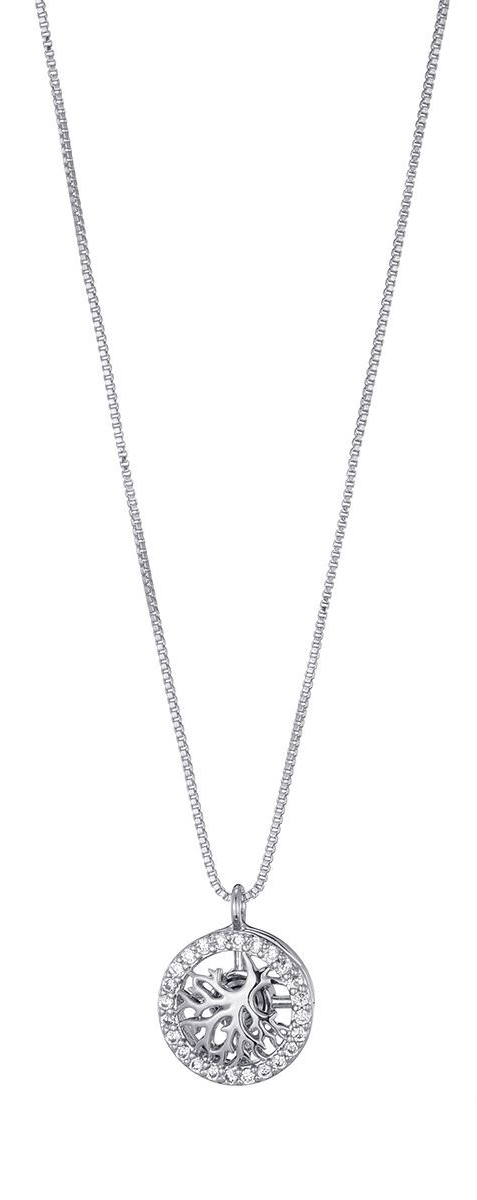 De ketting is en hanger is zilver van kleur en de rand rondom de levensboom is ingezet met zirkonia.