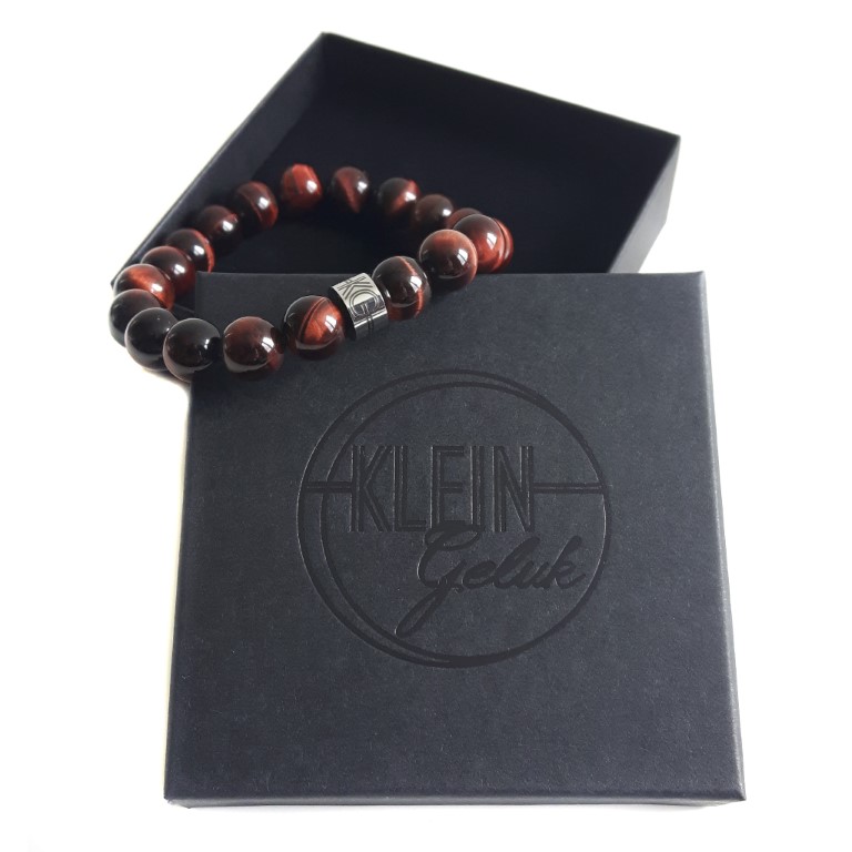 De rode tijgeroog heren of dames armband wordt geleverd in een milieuvriendelijk FSC®-gecertificeerde cadeauverpakking met daarin een kaartje waarop de werking van de steen beschreven staat.